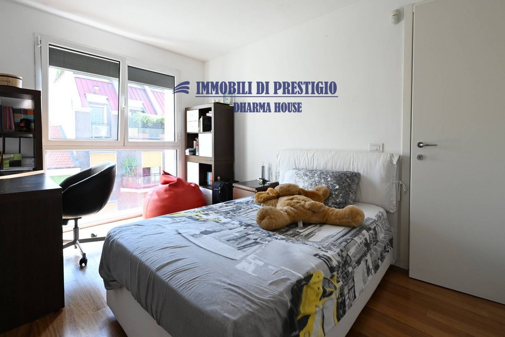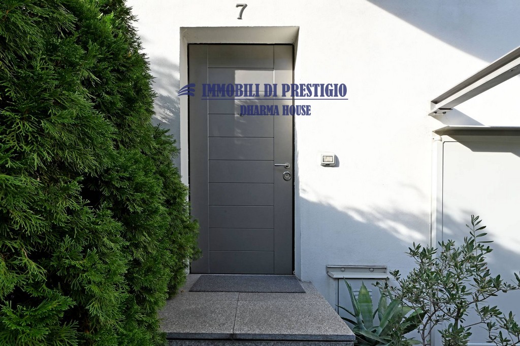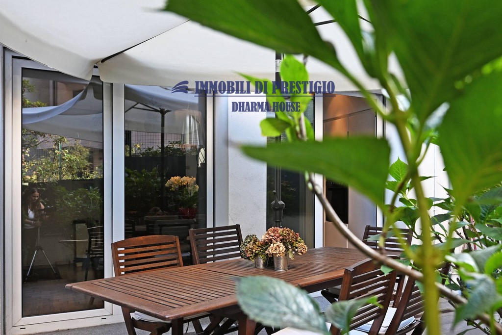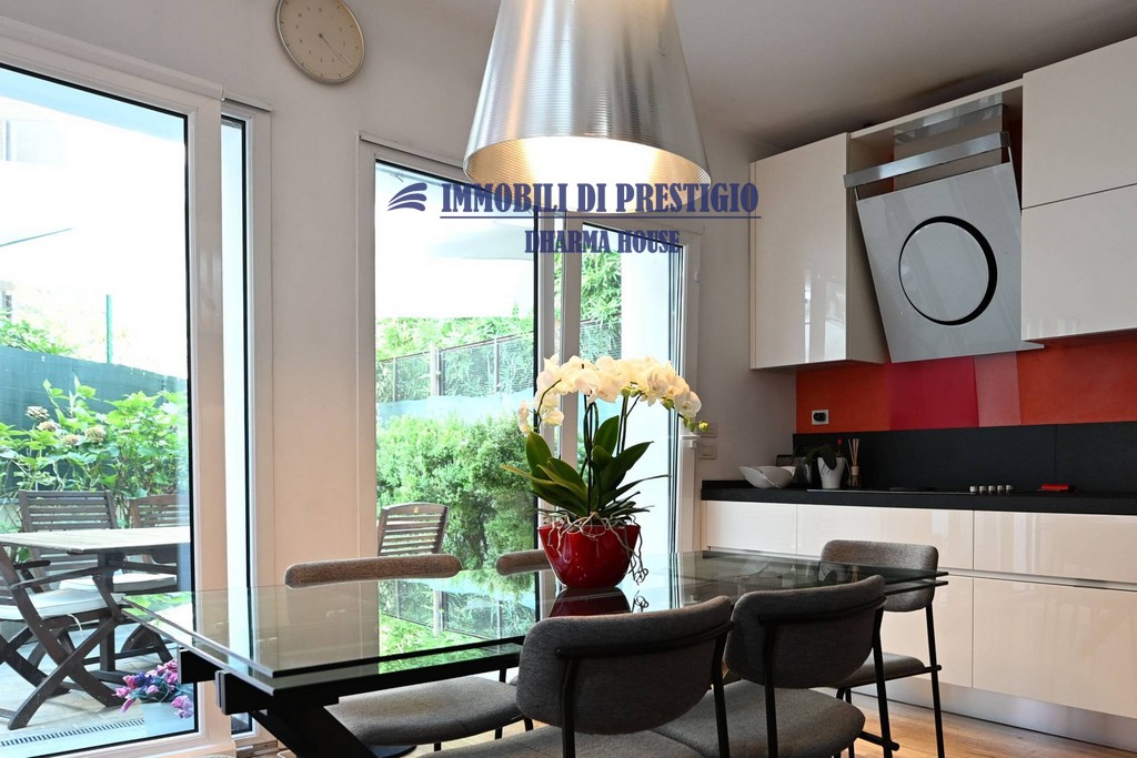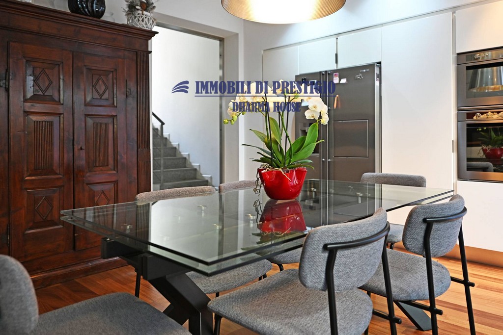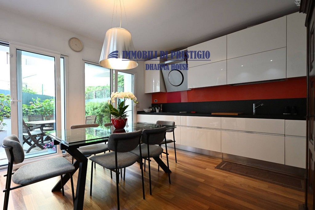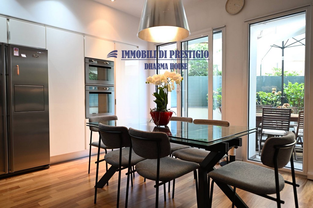 Al piano terreno la zona pranzo con l’elegante cucina a vista si apre con vetrate parietali su uno spazio esterno ideale per pranzi e cene in famiglia o con amici nella bella stagione.