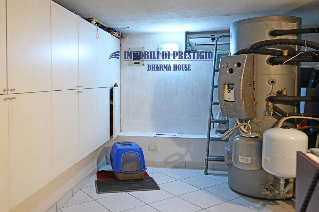Il riscaldamento a pavimento (impianto del 2009) è alimentato con metano da una caldaia del 2020, che fornisce anche l’acqua calda in sinergia con un pannello solare posizionato sul tetto.