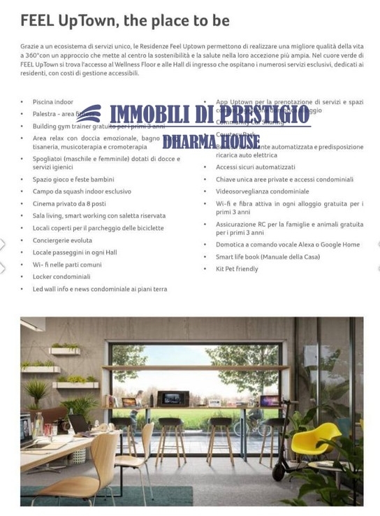 Ci troviamo nel condominio “Feel UpTown”, con servizi esclusivi dedicati al benessere dei residenti. Tra questi, spicca il Wellness Floor, uno spazio di 800 mq situato sotto un’area verde di 3.000 mq, dotato di piscina indoor, area relax e spa, spazio gioco bimbi, palestra e spogliatoi, tutti riservati ai soli residenti. Inoltre, sono presenti una Club House con tavoli da biliardo, area lounge e wine library, una dining area con postazioni grill all’aperto, e spazi dedicati al co-working e allo smart working.