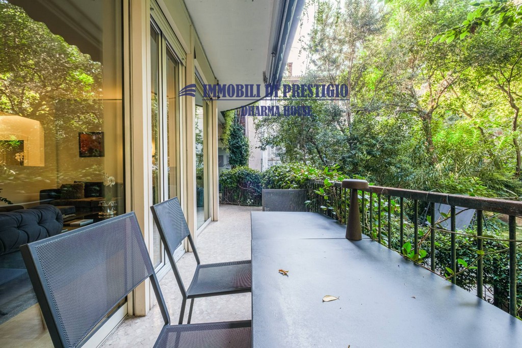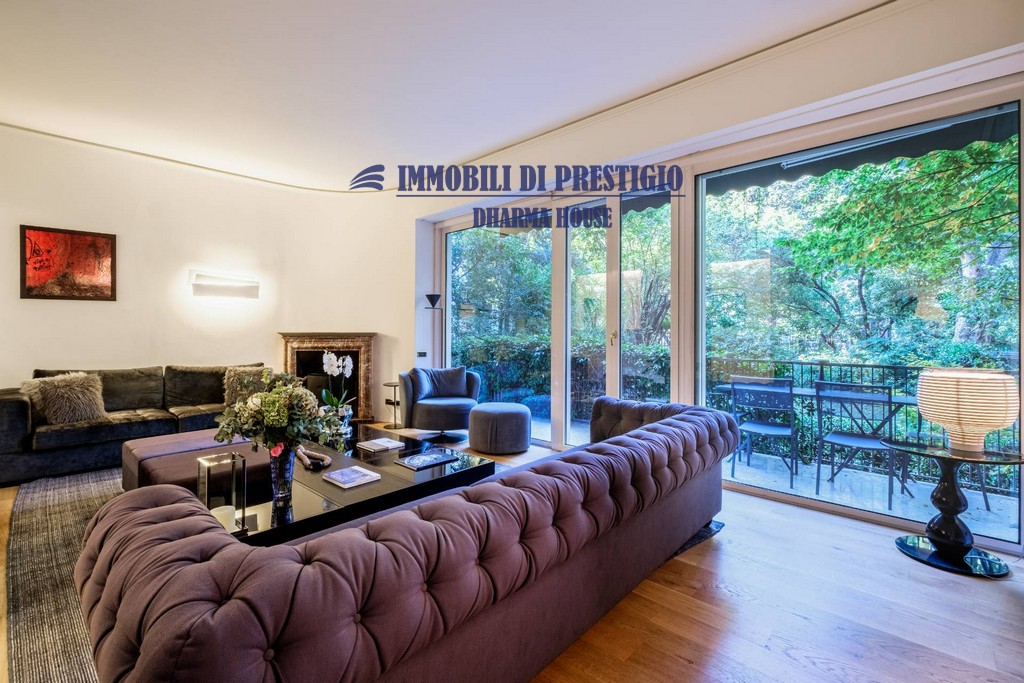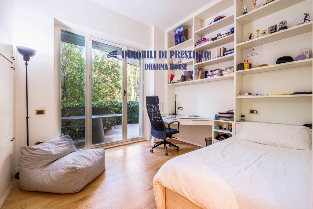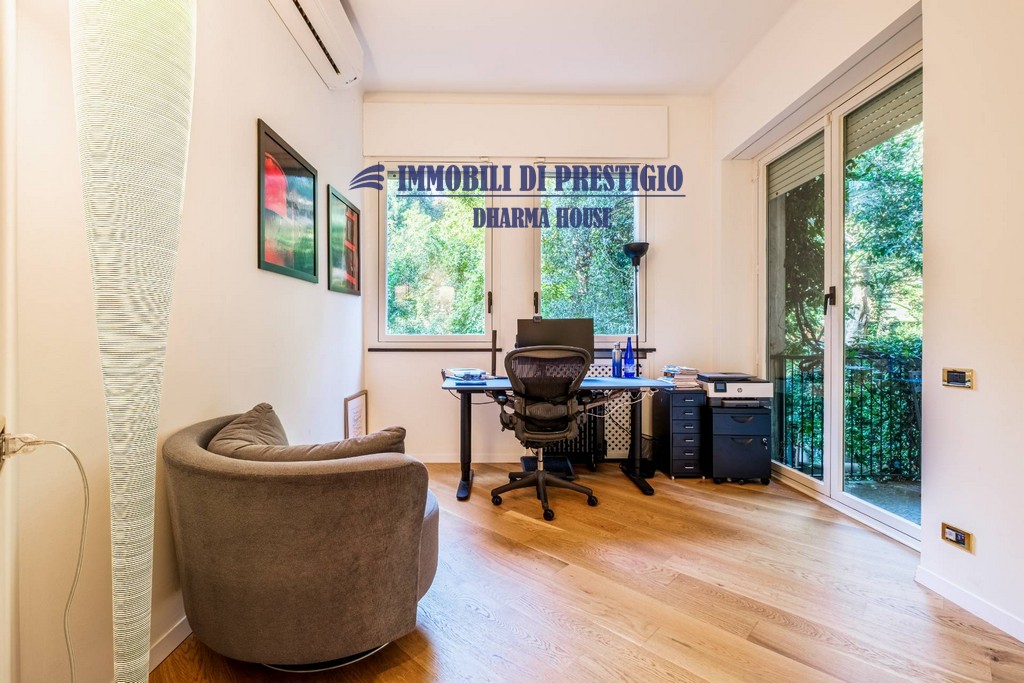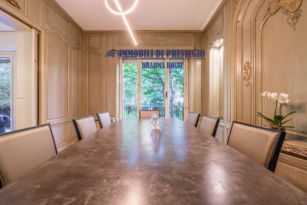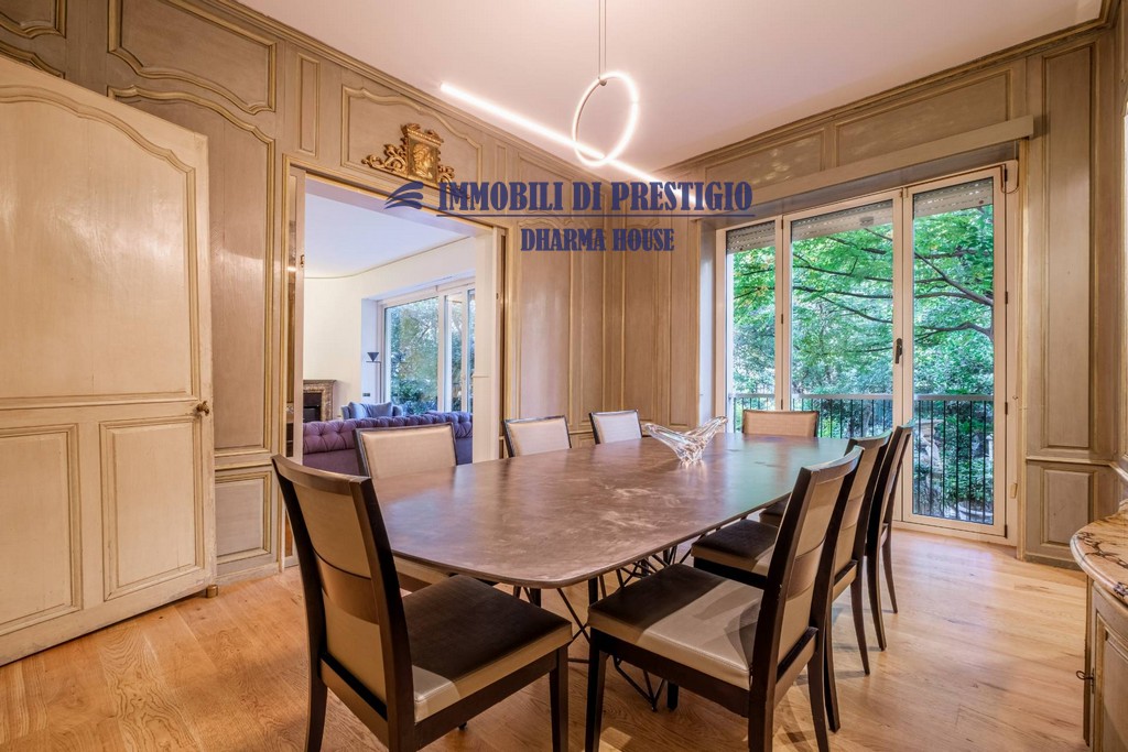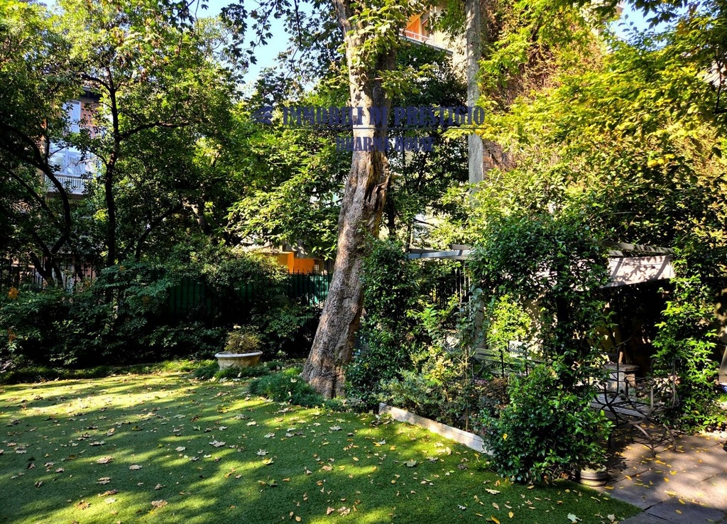 L’appartamento si apre su un ampio e prestigioso soggiorno di rappresentanza, con vista diretta sul verde, e una sala da pranzo elegante e accogliente, ideale per ospitare con stile e classe. La distribuzione interna comprende nella zona notte quattro camere da letto e tre bagni; nella zona giorno una spaziosa cucina con balcone, un bagno ospiti e due comodi ripostigli, offrendo comfort e funzionalità a chi la abita. Gli interni si caratterizzano per i soffitti alti e le grandi vetrate con infissi di ultima generazione, che assicurano efficienza termica, massima luminosità e una vista impareggiabile sul giardino.