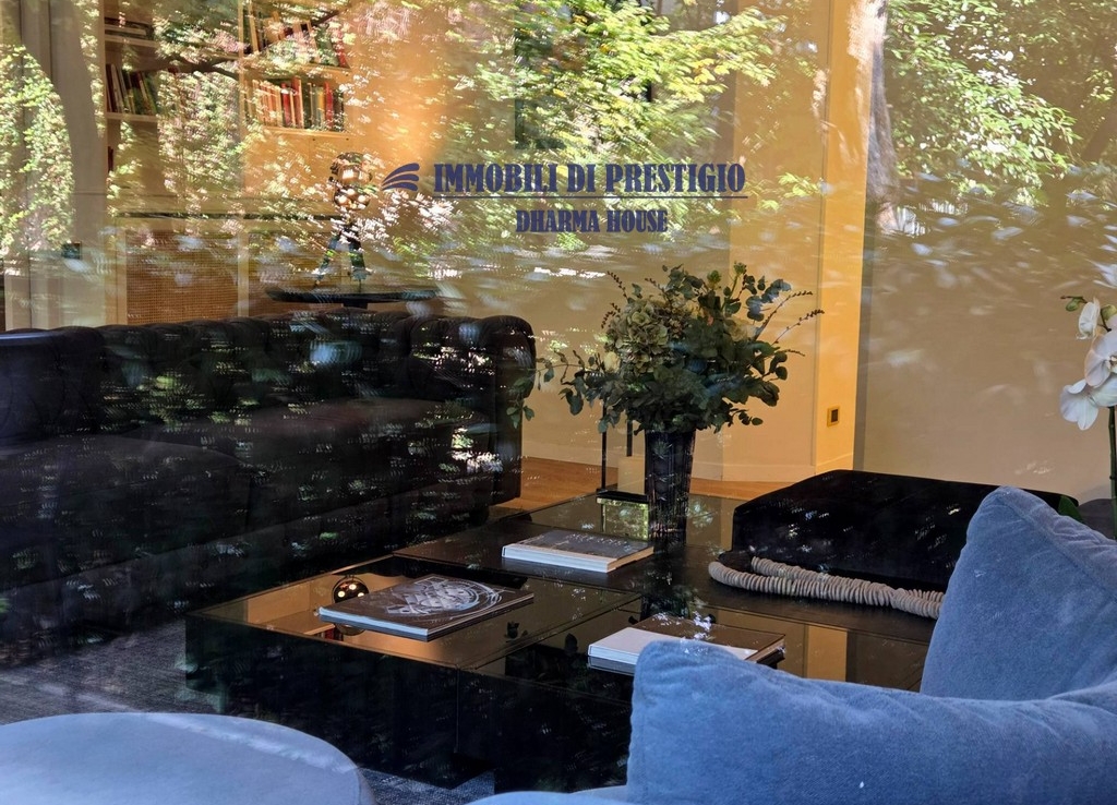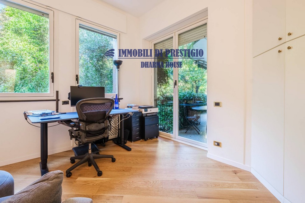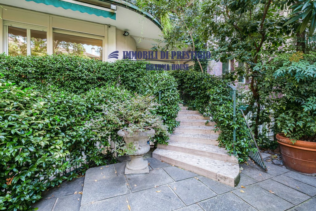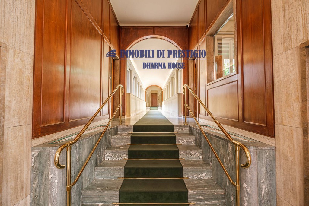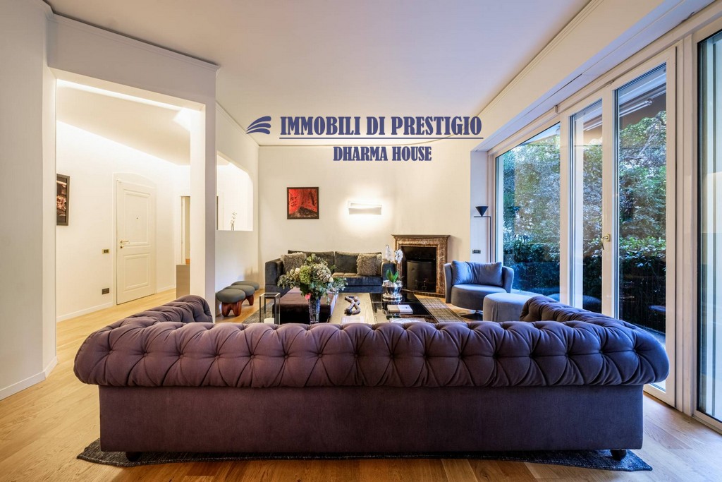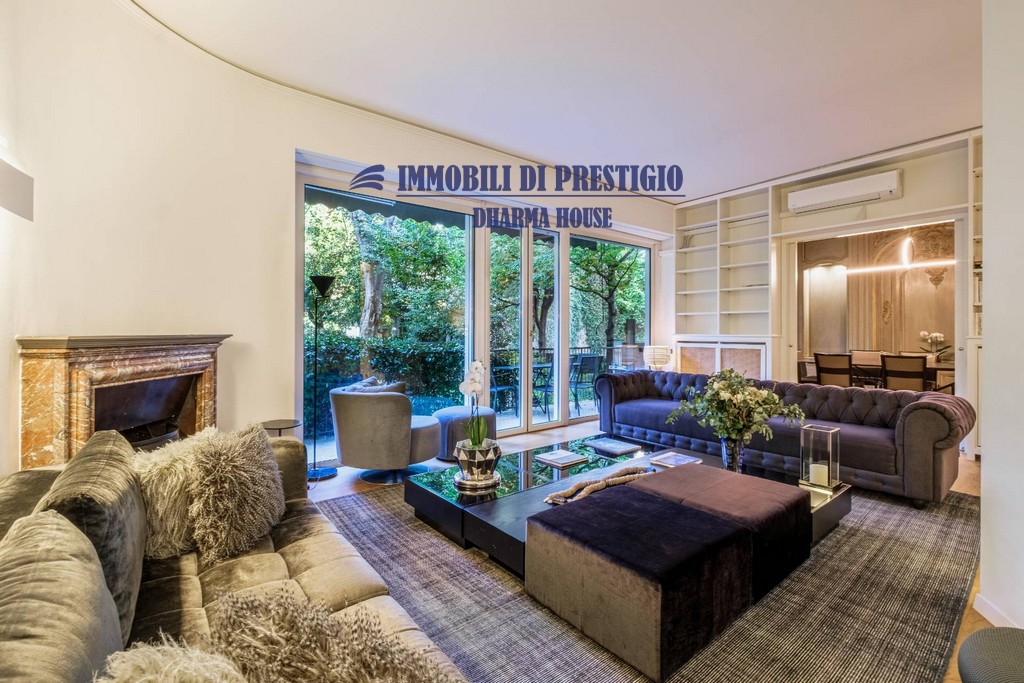 L’appartamento si apre su un ampio e prestigioso soggiorno di rappresentanza, con vista diretta sul verde, e una sala da pranzo elegante e accogliente, ideale per ospitare con stile e classe. La distribuzione interna comprende nella zona notte quattro camere da letto e tre bagni; nella zona giorno una spaziosa cucina con balcone, un bagno ospiti e due comodi ripostigli, offrendo comfort e funzionalità a chi la abita. Gli interni si caratterizzano per i soffitti alti e le grandi vetrate con infissi di ultima generazione, che assicurano efficienza termica, massima luminosità e una vista impareggiabile sul giardino.