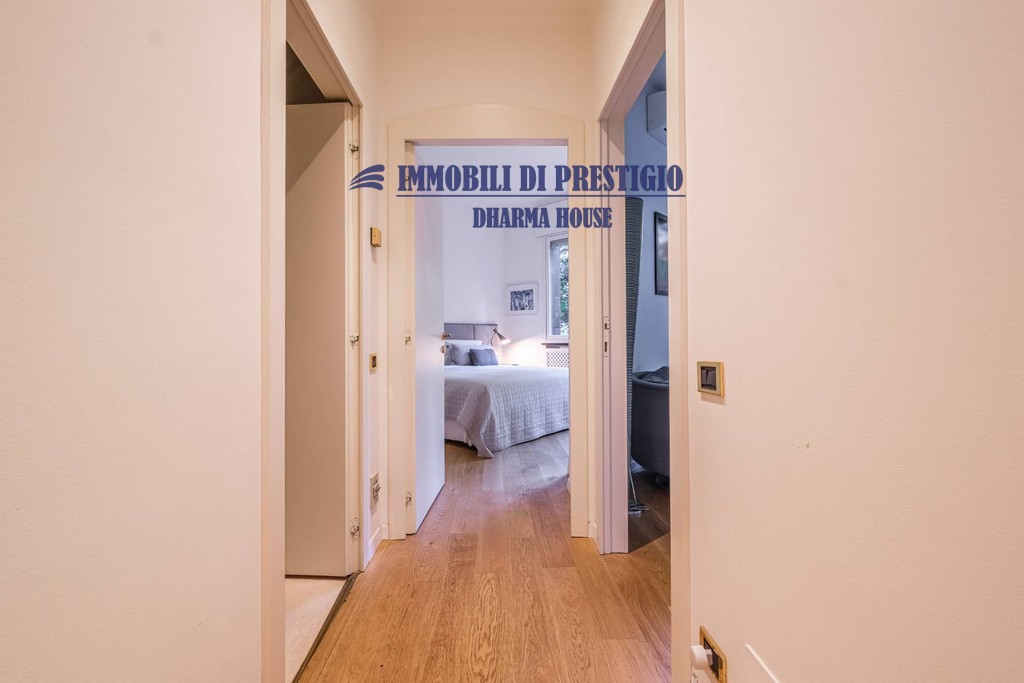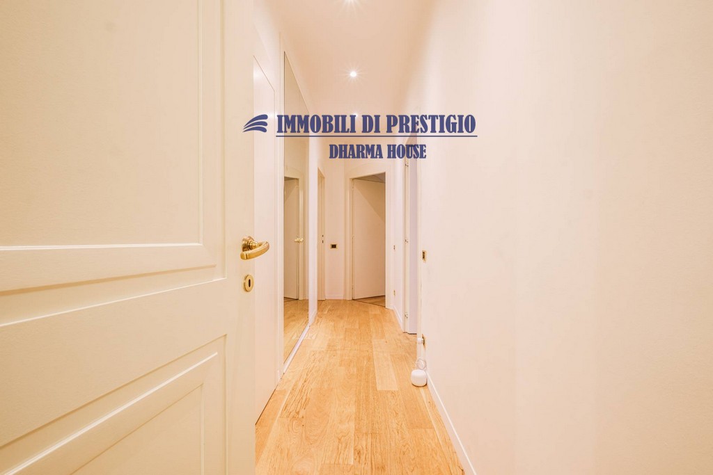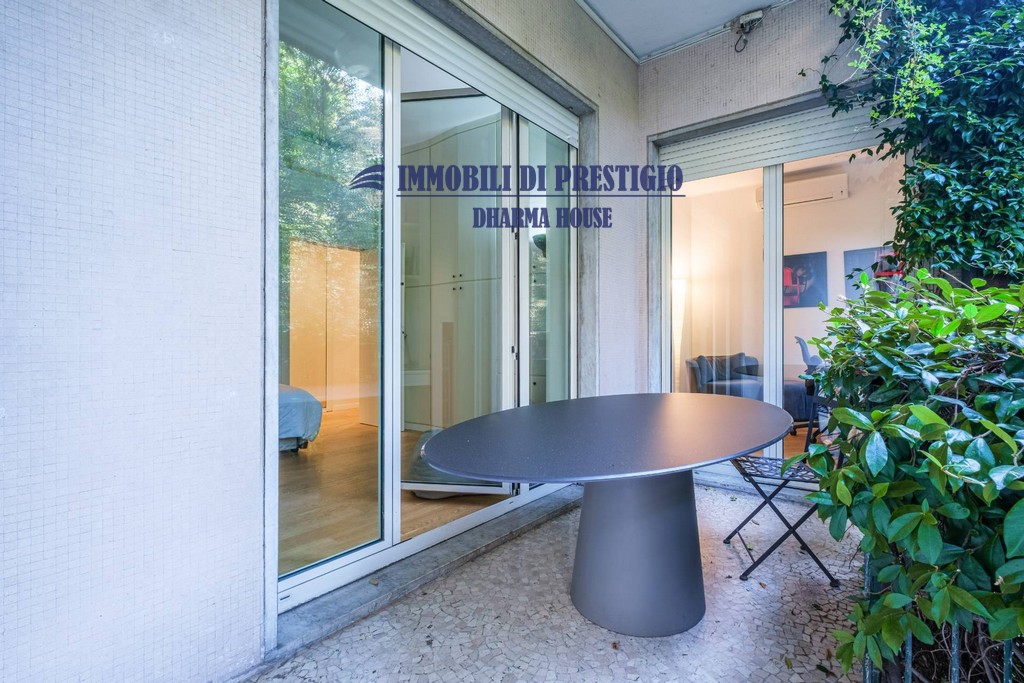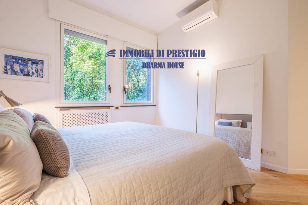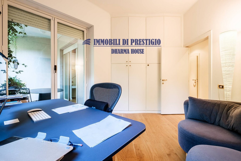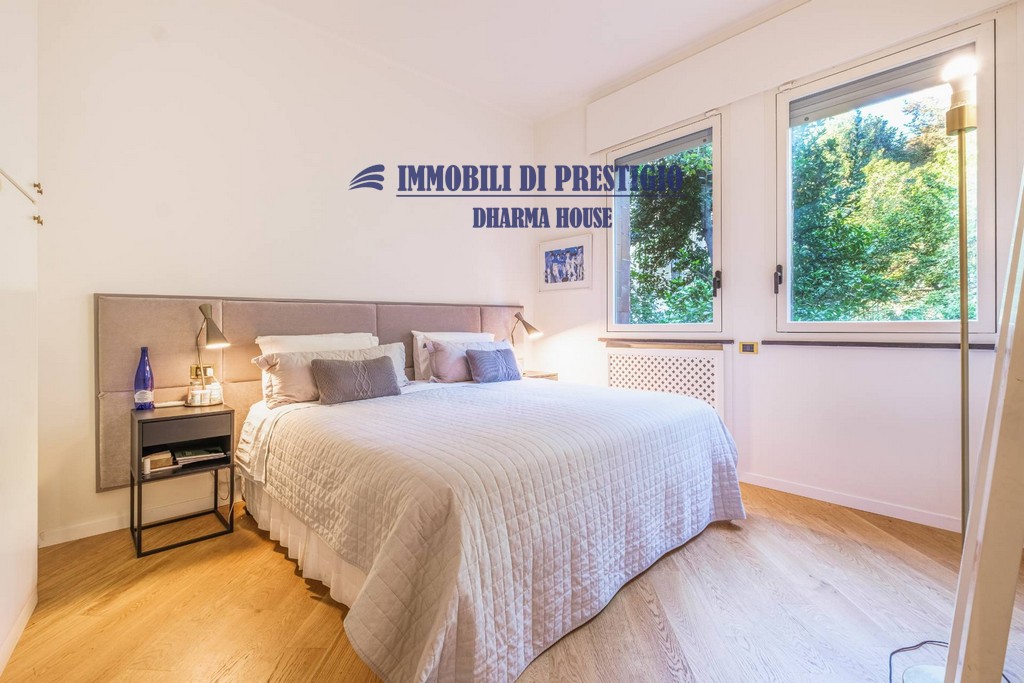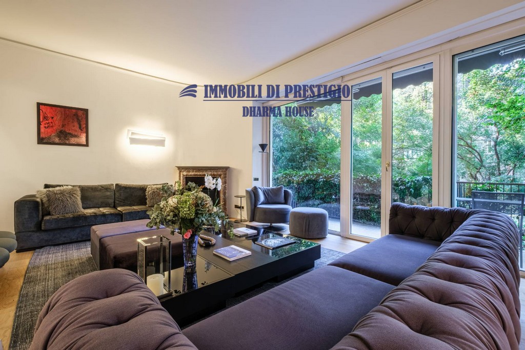 L’appartamento si apre su un ampio e prestigioso soggiorno di rappresentanza, con vista diretta sul verde, e una sala da pranzo elegante e accogliente, ideale per ospitare con stile e classe. La distribuzione interna comprende nella zona notte quattro camere da letto e tre bagni; nella zona giorno una spaziosa cucina con balcone, un bagno ospiti e due comodi ripostigli, offrendo comfort e funzionalità a chi la abita. Gli interni si caratterizzano per i soffitti alti e le grandi vetrate con infissi di ultima generazione, che assicurano efficienza termica, massima luminosità e una vista impareggiabile sul giardino.